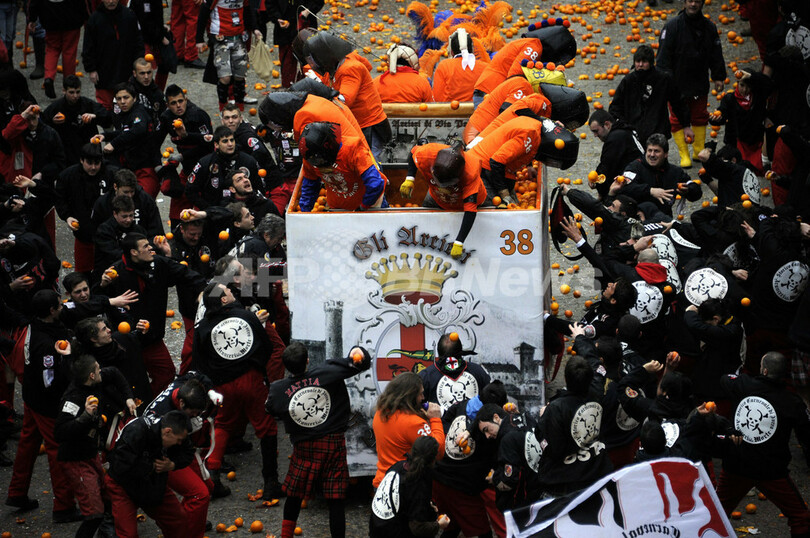 ニュース ライフ 名物カーニバル「オレンジ戦争」、イタリア 2011年3月8日 8:38 発信地:イブレア/イタリア [ ヨーロッパ イタリア ] このニュースをシェア ‹ › ❮ 23/23 ❯ イタリア北部のイブレア(Ivrea)で7日、「オレンジ戦争」と呼ばれる伝統のカーニバルが開催された。この祭りは中世の圧制者に対し民衆が起こした反乱を再現したもので、馬車に乗った圧制者の衛兵とその周りを取り囲む民衆、それぞれに扮した人びとがオレンジを投げ合った。(2011年3月7日撮影)(c)AFP/OLIVIER MORIN 【動画】オレンジを投げ合う参加者たち(YouTube/AFPBB News公式チャンネル) 画像作成中 ! 【3月8日 AFP】イタリア北部のイブレア(Ivrea)で7日、「オレンジ戦争」と呼ばれる伝統のカーニバルが開催された。この祭りは中世の圧制者に対し民衆が起こした反乱を再現したもので、馬車に乗った圧制者の衛兵とその周りを取り囲む民衆、それぞれに扮した人びとがオレンジを投げ合った。(c)AFP ライフ 一覧へ> メディア・報道関係・法人の方向け 写真・動画 購入のお問合せ>