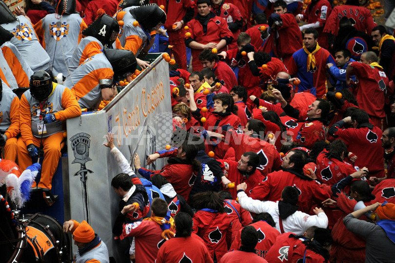 ニュース ライフ 名物カーニバル「オレンジ戦争」、イタリア 2011年3月8日 8:38 発信地:イブレア/イタリア [ ヨーロッパ イタリア ] このニュースをシェア ‹ › ❮ 22/23 ❯ イタリア北部のイブレア(Ivrea)で7日、「オレンジ戦争」と呼ばれる伝統のカーニバルが開催された。この祭りは中世の圧制者に対し民衆が起こした反乱を再現したもので、馬車に乗った圧制者の衛兵とその周りを取り囲む民衆、それぞれに扮した人びとがオレンジを投げ合うというもの。(2011年3月7日撮影)(c)AFP/OLIVIER MORIN 【動画】オレンジを投げ合う参加者たち(YouTube/AFPBB News公式チャンネル) 画像作成中 ! 【3月8日 AFP】イタリア北部のイブレア(Ivrea)で7日、「オレンジ戦争」と呼ばれる伝統のカーニバルが開催された。この祭りは中世の圧制者に対し民衆が起こした反乱を再現したもので、馬車に乗った圧制者の衛兵とその周りを取り囲む民衆、それぞれに扮した人びとがオレンジを投げ合った。(c)AFP ライフ 一覧へ> メディア・報道関係・法人の方向け 写真・動画 購入のお問合せ>