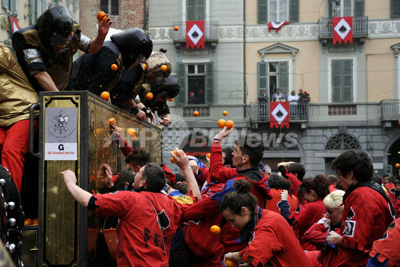 ニュース ライフ 名物カーニバル「オレンジ戦争」、イタリア 2011年3月8日 8:38 発信地:イブレア/イタリア [ ヨーロッパ イタリア ] このニュースをシェア ‹ › ❮ 21/23 ❯ イタリア北部のイブレア(Ivrea)で7日、「オレンジ戦争」と呼ばれる伝統のカーニバルが開催された。この祭りは中世の圧制者に対し民衆が起こした反乱を再現したもので、馬車に乗った圧制者の衛兵とその周りを取り囲む民衆、それぞれに扮した人びとがオレンジを投げ合った。(2011年3月7日撮影)(c)AFP/OLIVIER MORIN 【動画】オレンジを投げ合う参加者たち(YouTube/AFPBB News公式チャンネル) 画像作成中 ! 【3月8日 AFP】イタリア北部のイブレア(Ivrea)で7日、「オレンジ戦争」と呼ばれる伝統のカーニバルが開催された。この祭りは中世の圧制者に対し民衆が起こした反乱を再現したもので、馬車に乗った圧制者の衛兵とその周りを取り囲む民衆、それぞれに扮した人びとがオレンジを投げ合った。(c)AFP ライフ 一覧へ> メディア・報道関係・法人の方向け 写真・動画 購入のお問合せ>