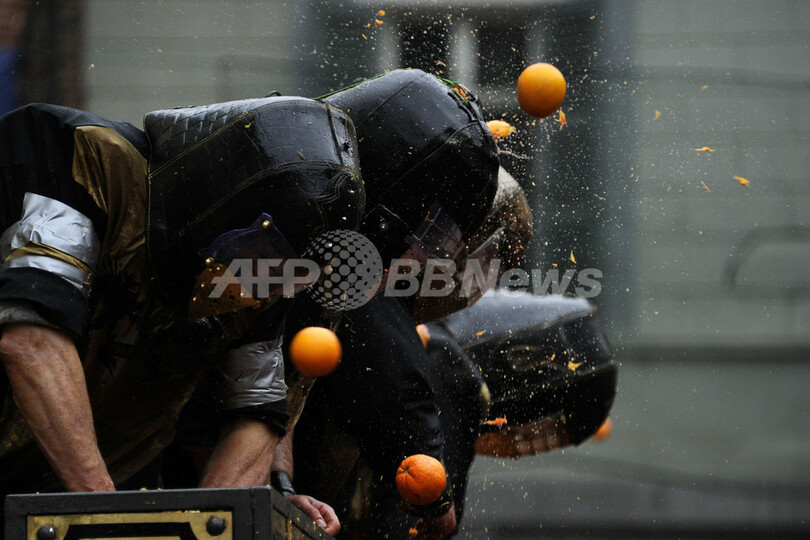 ニュース ライフ 名物カーニバル「オレンジ戦争」、イタリア 2011年3月8日 8:38 発信地:イブレア/イタリア [ ヨーロッパ イタリア ] このニュースをシェア ‹ › ❮ 20/23 ❯ イタリア北部のイブレア(Ivrea)で7日、「オレンジ戦争」と呼ばれる伝統のカーニバルが開催された。この祭りは中世の圧制者に対し民衆が起こした反乱を再現したもので、馬車に乗った圧制者の衛兵とその周りを取り囲む民衆、それぞれに扮した人びとがオレンジを投げ合った。(2011年3月7日撮影)(c)AFP/OLIVIER MORIN 【動画】オレンジを投げ合う参加者たち(YouTube/AFPBB News公式チャンネル) 画像作成中 ! 【3月8日 AFP】イタリア北部のイブレア(Ivrea)で7日、「オレンジ戦争」と呼ばれる伝統のカーニバルが開催された。この祭りは中世の圧制者に対し民衆が起こした反乱を再現したもので、馬車に乗った圧制者の衛兵とその周りを取り囲む民衆、それぞれに扮した人びとがオレンジを投げ合った。(c)AFP ライフ 一覧へ> メディア・報道関係・法人の方向け 写真・動画 購入のお問合せ>