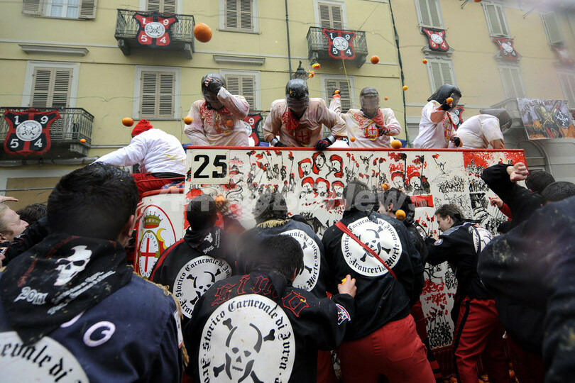 ニュース ライフ 名物カーニバル「オレンジ戦争」、イタリア 2011年3月8日 8:38 発信地:イブレア/イタリア [ ヨーロッパ イタリア ] このニュースをシェア ‹ › ❮ 19/23 ❯ イタリア北部のイブレア(Ivrea)で7日、「オレンジ戦争」と呼ばれる伝統のカーニバルが開催された。この祭りは中世の圧制者に対し民衆が起こした反乱を再現したもので、馬車に乗った圧制者の衛兵とその周りを取り囲む民衆、それぞれに扮した人びとがオレンジを投げ合った。(2011年3月7日撮影)(c)AFP/OLIVIER MORIN 【動画】オレンジを投げ合う参加者たち(YouTube/AFPBB News公式チャンネル) 画像作成中 ! 【3月8日 AFP】イタリア北部のイブレア(Ivrea)で7日、「オレンジ戦争」と呼ばれる伝統のカーニバルが開催された。この祭りは中世の圧制者に対し民衆が起こした反乱を再現したもので、馬車に乗った圧制者の衛兵とその周りを取り囲む民衆、それぞれに扮した人びとがオレンジを投げ合った。(c)AFP ライフ 一覧へ> メディア・報道関係・法人の方向け 写真・動画 購入のお問合せ>