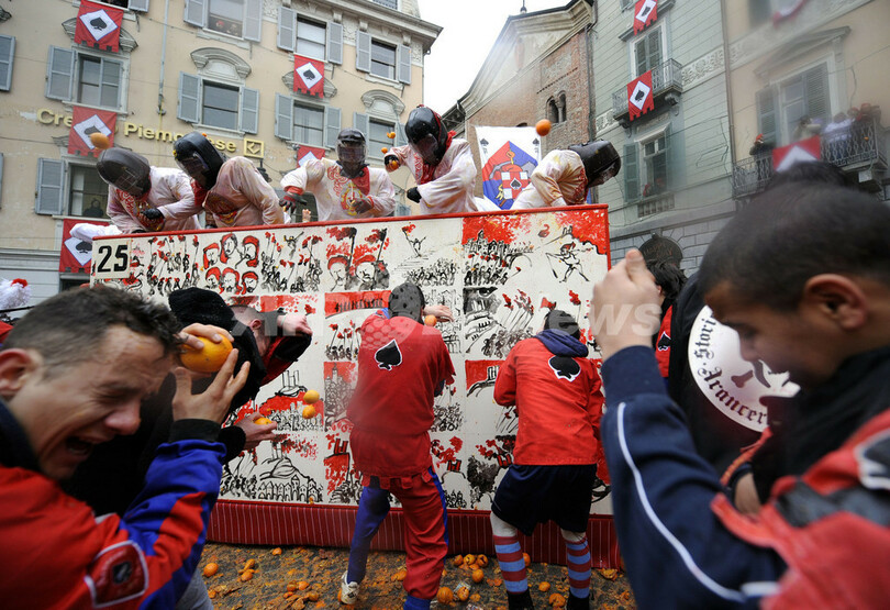 ニュース ライフ 名物カーニバル「オレンジ戦争」、イタリア 2011年3月8日 8:38 発信地:イブレア/イタリア [ ヨーロッパ イタリア ] このニュースをシェア ‹ › ❮ 7/23 ❯ イタリア北部のイブレア(Ivrea)で7日、「オレンジ戦争」と呼ばれる伝統のカーニバルが開催された。この祭りは中世の圧制者に対し民衆が起こした反乱を再現したもので、馬車に乗った圧制者の衛兵とその周りを取り囲む民衆、それぞれに扮した人びとがオレンジを投げ合った。(2011年3月7日撮影)(c)AFP/OLIVIER MORIN 【動画】オレンジを投げ合う参加者たち(YouTube/AFPBB News公式チャンネル) 画像作成中 ! 【3月8日 AFP】イタリア北部のイブレア(Ivrea)で7日、「オレンジ戦争」と呼ばれる伝統のカーニバルが開催された。この祭りは中世の圧制者に対し民衆が起こした反乱を再現したもので、馬車に乗った圧制者の衛兵とその周りを取り囲む民衆、それぞれに扮した人びとがオレンジを投げ合った。(c)AFP ライフ 一覧へ> メディア・報道関係・法人の方向け 写真・動画 購入のお問合せ>