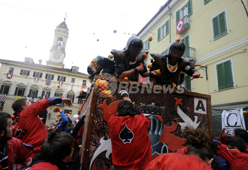 ニュース ライフ 名物カーニバル「オレンジ戦争」、イタリア 2011年3月8日 8:38 発信地:イブレア/イタリア [ ヨーロッパ イタリア ] このニュースをシェア ‹ › ❮ 6/23 ❯ イタリア北部のイブレア(Ivrea)で7日、「オレンジ戦争」と呼ばれる伝統のカーニバルが開催された。この祭りは中世の圧制者に対し民衆が起こした反乱を再現したもので、馬車に乗った圧制者の衛兵とその周りを取り囲む民衆、それぞれに扮した人びとがオレンジを投げ合った。(2011年3月7日撮影)(c)AFP/OLIVIER MORIN 【動画】オレンジを投げ合う参加者たち(YouTube/AFPBB News公式チャンネル) 画像作成中 ! 【3月8日 AFP】イタリア北部のイブレア(Ivrea)で7日、「オレンジ戦争」と呼ばれる伝統のカーニバルが開催された。この祭りは中世の圧制者に対し民衆が起こした反乱を再現したもので、馬車に乗った圧制者の衛兵とその周りを取り囲む民衆、それぞれに扮した人びとがオレンジを投げ合った。(c)AFP ライフ 一覧へ> メディア・報道関係・法人の方向け 写真・動画 購入のお問合せ>
