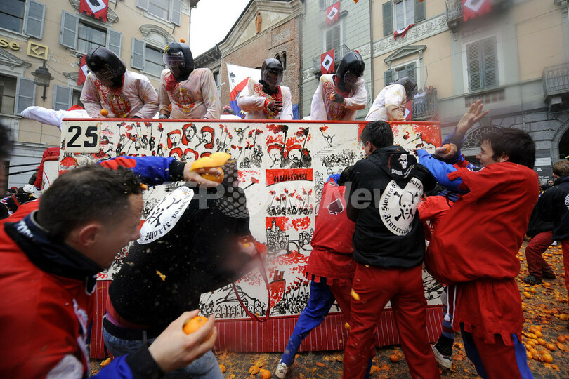 ニュース ライフ 名物カーニバル「オレンジ戦争」、イタリア 2011年3月8日 8:38 発信地:イブレア/イタリア [ ヨーロッパ イタリア ] このニュースをシェア ‹ › ❮ 5/23 ❯ イタリア北部のイブレア(Ivrea)で7日、「オレンジ戦争」と呼ばれる伝統のカーニバルが開催された。この祭りは中世の圧制者に対し民衆が起こした反乱を再現したもので、馬車に乗った圧制者の衛兵とその周りを取り囲む民衆、それぞれに扮した人びとがオレンジを投げ合った。(2011年3月7日撮影)(c)AFP/OLIVIER MORIN 【動画】オレンジを投げ合う参加者たち(YouTube/AFPBB News公式チャンネル) 画像作成中 ! 【3月8日 AFP】イタリア北部のイブレア(Ivrea)で7日、「オレンジ戦争」と呼ばれる伝統のカーニバルが開催された。この祭りは中世の圧制者に対し民衆が起こした反乱を再現したもので、馬車に乗った圧制者の衛兵とその周りを取り囲む民衆、それぞれに扮した人びとがオレンジを投げ合った。(c)AFP ライフ 一覧へ> メディア・報道関係・法人の方向け 写真・動画 購入のお問合せ>