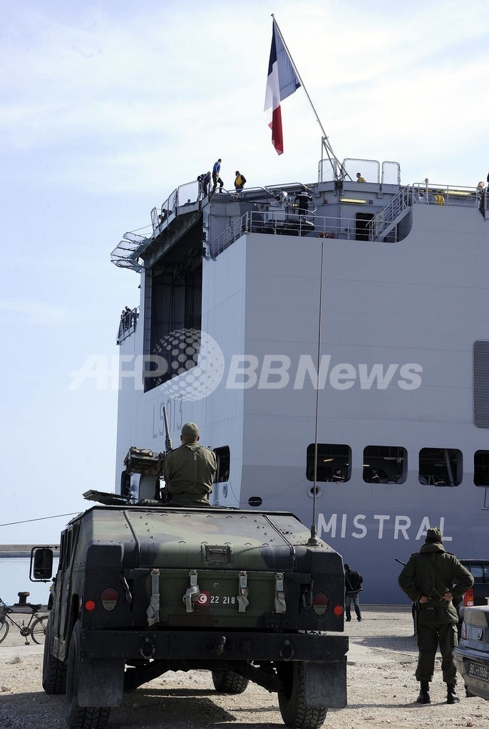 フランスが誇る強襲揚陸艦ミストラル(Mistral)は5日、避難民をエジプトのアレクサンドリア(Alexandria)に運ぶ任務を帯びてフランス南部のトゥーロン(Toulon)港を出発し、7日にチュニジアのザルジス(Zarzis)港に到着した。しかし、停泊後間もなく、仏海軍は避難民を乗せずに同日中に出港すると発表した。