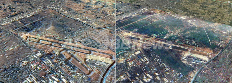 台湾の衛星「Formosat-2」が撮影した、津波が到達する前(左)と後の仙台空港の画像(左は2011年3月11日撮影、右は3月13日撮影)。(c)AFP/GEODAC, National Cheng-Kung University - National Space Organization