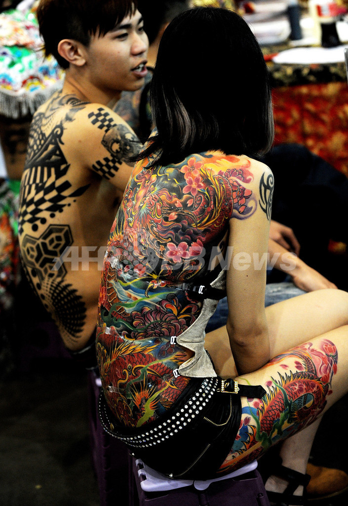 写真はタトゥーを披露する参加者たち(2011年3月11日撮影)。(c)AFP/Greg WOOD