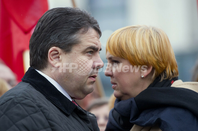 写真はベルリンで行われたデモに参加した、社会民主党(SPD)のジグマル・ガブリエル(Sigmar Gabriel)党首(左)と、緑の党(Green party)のクラウディア・ロート(Claudia Roth)共同代表(右、2011年3月14日撮影)。(c)AFP/JOHANNES EISELE