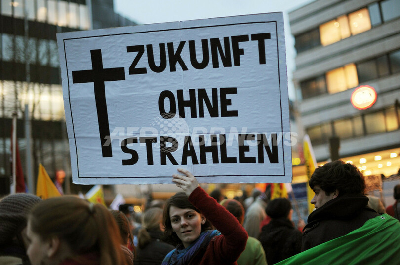 写真はドイツ西部カッセル(Kassel)で開かれたデモでプラカードを掲げるデモ参加者(2011年3月14日撮影)。(c)AFP/UWE ZUCCHI