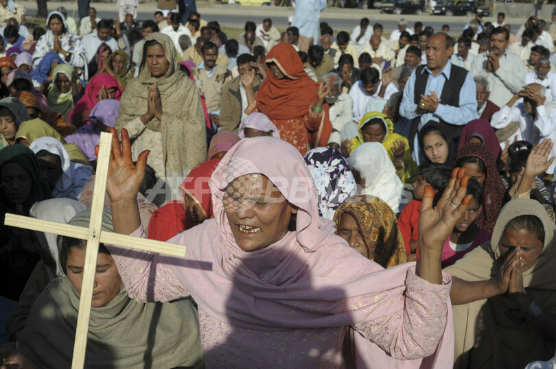 世界各地で、11日に発生した東北地方太平洋沖地震で被災した人たちのための祈りが捧げられている。写真は、パキスタン・イスラマバード(Islamabad)で祈りを捧げるクリスチャンの人びと(2011年3月12日撮影)。(c)AFP/Farooq NAEEM
