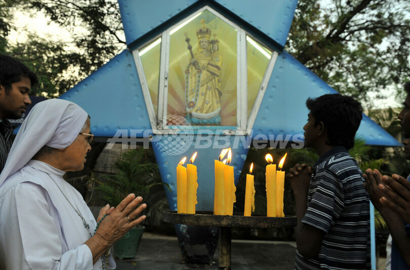 世界各地で、11日に発生した東北地方太平洋沖地震で被災した人たちのための祈りが捧げられている。写真は、インド・ハイデラバード(Hyderabad)で祈るカトリック教徒ら(2011年3月14日撮影)。(c)AFP/Noah SEELAM