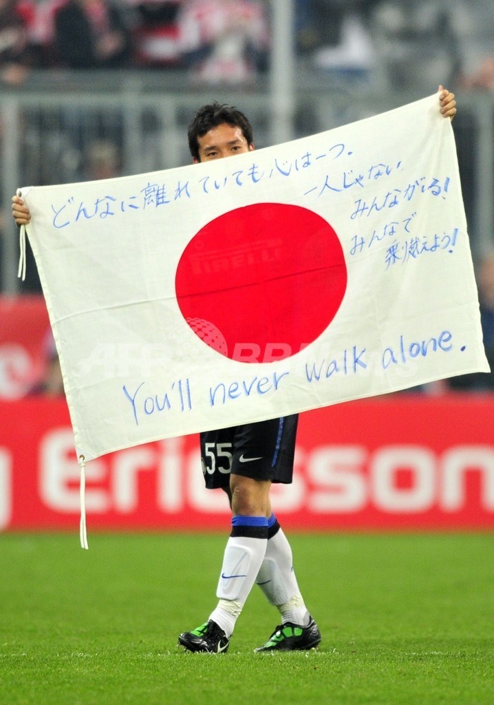 【3月16日 AFP】(写真追加)ドイツ南部ミュンヘン(Munich)で15日行われたサッカー・欧州チャンピオンズリーグ2010-11(UEFA Champions League 2010-11)決勝トーナメント1回戦、インテル(Inter Milan)対バイエルン・ミュンヘン(Bayern Munich)第2戦。後半42分に交代出場したインテルの長友佑都(Yuto Nagatomo)は、試合後、「You'll never walk alone(一人じゃない)」と書かれた日の丸を掲げた。試合は3-2でインテルが勝利、2戦合計スコアを3-3とし、アウェーゴールで準々決勝進出を決めた。(c)AFP