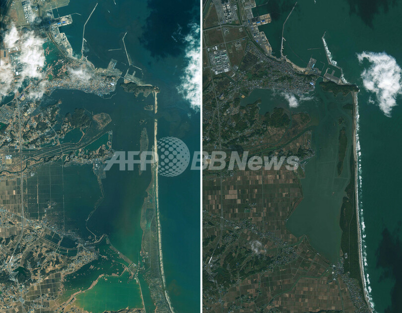 【3月18日 AFP】米航空宇宙局(NASA)や米画像衛星運営会社ジオアイ(GeoEye)が公開した、東北地方太平洋沖地震の前後の、被災地の衛星写真。(c)AFP