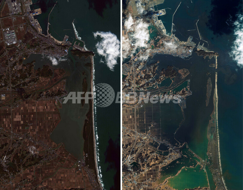 【3月18日 AFP】米航空宇宙局(NASA)や米画像衛星運営会社ジオアイ(GeoEye)が公開した、東北地方太平洋沖地震の前後の、被災地の衛星写真。(c)AFP