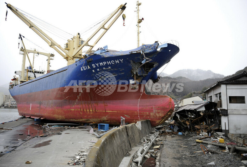 ニュース 社会 岸壁に乗り上げた大型船舶、フィリピン人乗員は全員無事 2011年3月19日 12:14 発信地:釜石/岩手 [ アジア・オセアニア 岩手 ] このニュースをシェア ‹ › ❮ 3/6 ❯ 岩手県・釜石市の岸壁に乗り上げた大型船舶「アジアシンフォニー(M.V. Asia Symphony)」(2011年3月16日撮影)。(c)AFP/TOSHIFUMI KITAMURA 画像作成中 ! 【3月19日 AFP】東北地方太平洋沖地震と津波で大きな被害を受けた岩手県釜石市の岸壁に乗り上げた船舶。この「アジアシンフォニー(M.V. Asia Symphony)」(4724トン)に乗っていたフィリピン人乗員17人は全員が無事避難し、避難所に滞在している。(c)AFP 社会 一覧へ> メディア・報道関係・法人の方向け 写真・動画 購入のお問合せ>