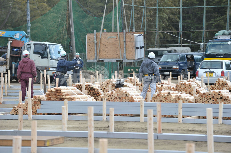 最初の仮設住宅200戸を建てている大和ハウス工業(Daiwa House)広報によると、政府から全仮設住宅メーカーに対し、計3万戸の建設要請があった。すべての仮設住宅には、トイレや風呂、暖房、水道など普通の家と同じ設備が備わっている。同社ではプレハブ住宅の建設を増やそうとしているが、被害の規模が大きすぎて困難な作業になっている。(c)AFP/Huw Griffith