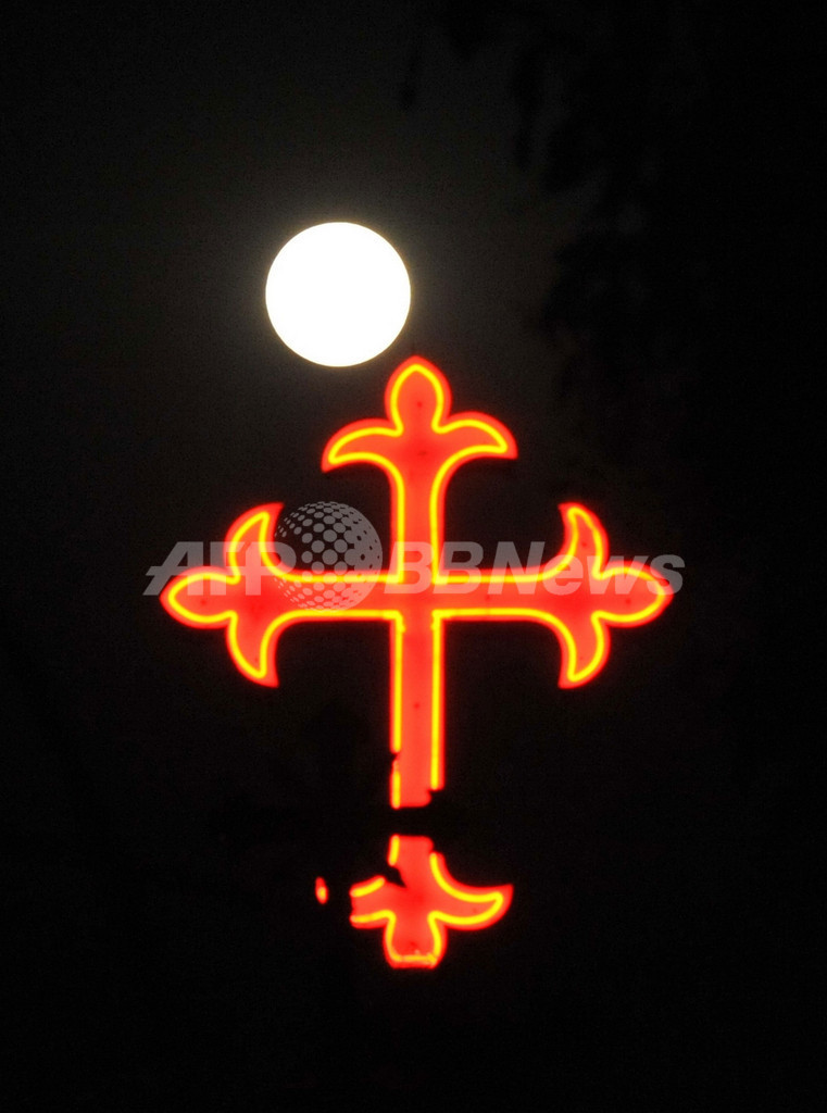 写真は、インド中部ハイデラバード(Hyderabad)の十字架の向こうに見える満月(2011年3月19日撮影)。(c)AFP/Noah SEELAM