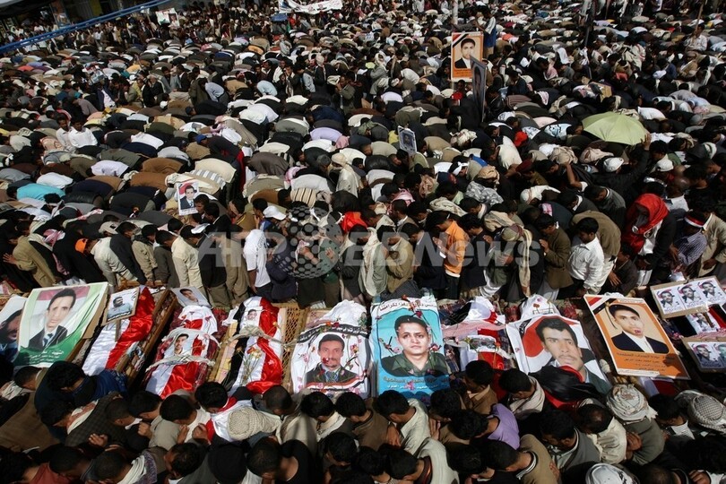 一方、首都サヌア(Sanaa)のサヌア大学(Sanaa University)近くの広場では同日、18日に起きたサレハ大統領支持の武装集団によるデモ隊への銃撃で死亡したデモ参加者30人の葬儀が営まれ、非常事態宣言下の厳重な警戒態勢のなか、死者を悼む数万人が集まった。参列者らによると、1月末に反政府デモが始まって以来、最大の集会という。