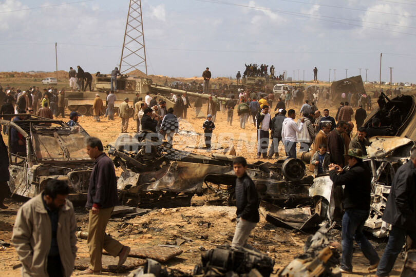 最高指導者ムアマル・カダフィ(Moamer Kadhafi)大佐のリビア政権軍は23日、反体制派が掌握する複数の都市を戦車で攻撃、民間人が相次いで避難している。一方、英司令官がリビア空軍は戦闘能力を失ったと述べるなど、多国籍軍の攻撃目標はカダフィ派の地上部隊に移りつつある。