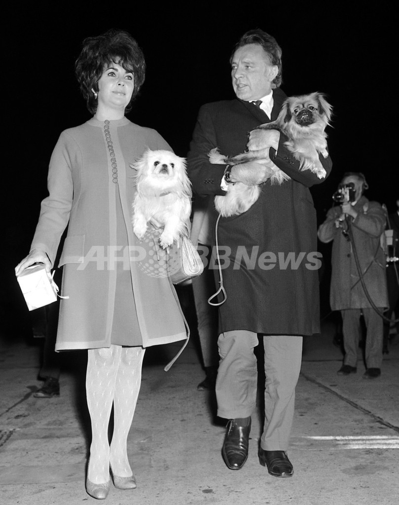 写真は、5人目の夫となった英俳優リチャード・バートン(Richard Burton)さん(右)とテイラーさん。パリ郊外ルブルジェ(Le Bourget)の空港にて(1967年2月16日撮影)。(c)AFP