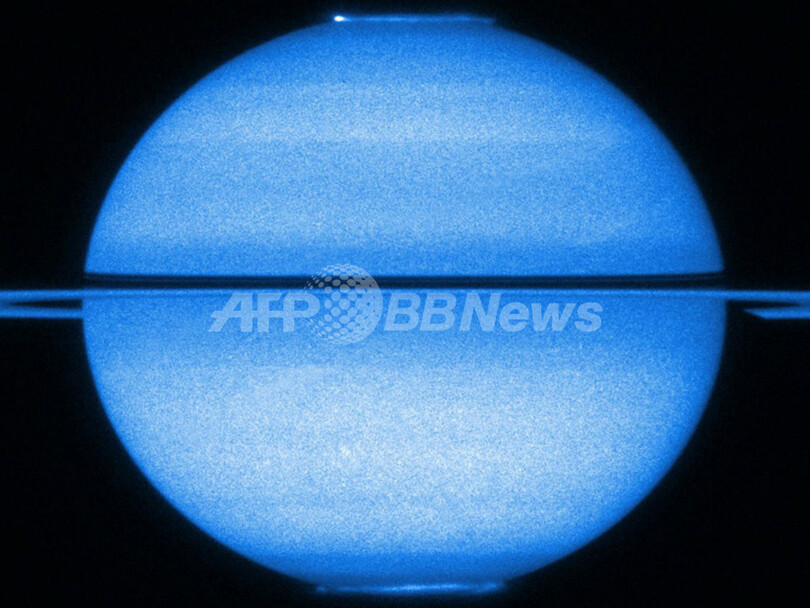 【3月25日 AFP】米航空宇宙局(NASA)が24日公開した、輪が真横になり、両極にゆらめくオーロラが見える土星の画像。ハッブル宇宙望遠鏡(Hubble Space Telescope)が2009年に撮影した。
