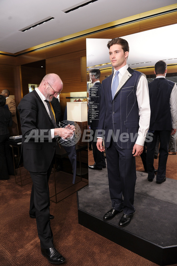 会場では、同ブランドのテイラーJasmine Bejsilovercがモデルの採寸や仮縫いを行い、“500以上の手間がかかる”というスーツのテーラリングを実演。アメリカンフットボールの選手のバート・スコット(Bart Scott)やジェイソン・テイラー(Jason Taylor)をはじめ、メンズファッション誌の編集者らが出席した。(c)AFP/Getty Images