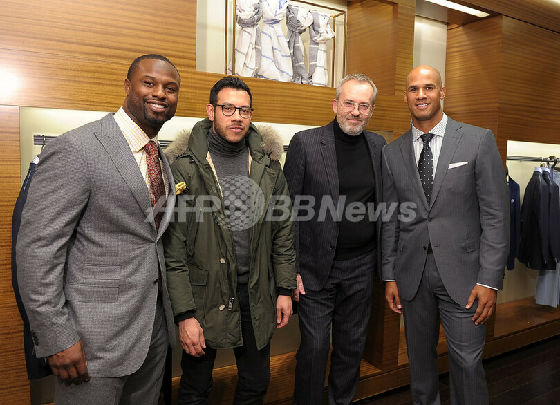会場では、同ブランドのテイラーJasmine Bejsilovercがモデルの採寸や仮縫いを行い、“500以上の手間がかかる”というスーツのテーラリングを実演。アメリカンフットボールの選手のバート・スコット(Bart Scott)やジェイソン・テイラー(Jason Taylor)をはじめ、メンズファッション誌の編集者らが出席した。(c)AFP/Getty Images