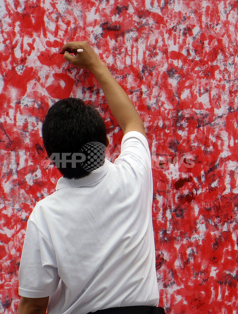 ニュース 社会 市民の手形で「日の丸」を、被災者への連帯表明 インドネシア 2011年3月27日 16:36 発信地:ジャカルタ/インドネシア [ アジア・オセアニア インドネシア ] このニュースをシェア ‹ › ❮ 3/4 ❯ インドネシア・ジャカルタ(Jakarta)の日本大使館前で、「日の丸」を表現した赤い円の中に赤い手形をつけて、被災者への連帯を表明する男性(2011年3月27日撮影)。(c)AFP/Bay ISMOYO 画像作成中 ! 【3月27日 AFP】インドネシア、在ジャカルタ(Jakarta)日本大使館前で27日、東北地方太平洋沖地震・津波の被災者への連帯を表明しようと、市民が「日の丸」を表現した赤い円の中を、赤いインクの手形で埋めた。(c)AFP 社会 一覧へ> メディア・報道関係・法人の方向け 写真・動画 購入のお問合せ>