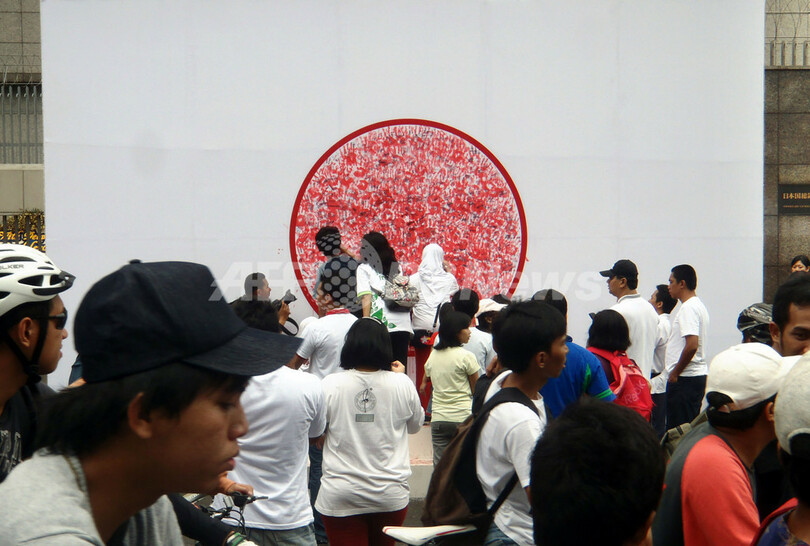 ニュース 社会 市民の手形で「日の丸」を、被災者への連帯表明 インドネシア 2011年3月27日 16:36 発信地:ジャカルタ/インドネシア [ アジア・オセアニア インドネシア ] このニュースをシェア ‹ › ❮ 2/4 ❯ インドネシア・ジャカルタ(Jakarta)の日本大使館前で、「日の丸」を表現した赤い円の中に赤い手形をつけて、被災者への連帯を表明する人びと(2011年3月27日撮影)。(c)AFP/Bay ISMOYO 画像作成中 ! 【3月27日 AFP】インドネシア、在ジャカルタ(Jakarta)日本大使館前で27日、東北地方太平洋沖地震・津波の被災者への連帯を表明しようと、市民が「日の丸」を表現した赤い円の中を、赤いインクの手形で埋めた。(c)AFP 社会 一覧へ> メディア・報道関係・法人の方向け 写真・動画 購入のお問合せ>