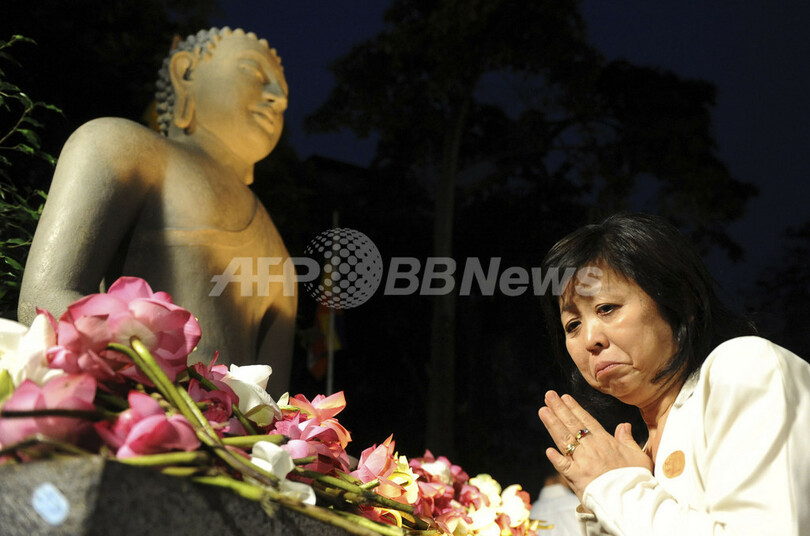 写真は、地震・津波犠牲者の追悼儀式で、仏像に祈る女性(2011年3月27日撮影)。(c)AFP/Ishara S.KODIKARA