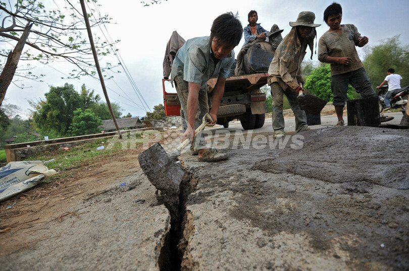 写真は、ミャンマー北東部のタチレク(Tachilek)で地震で亀裂が入った道路を修復する人たち(2011年3月26日撮影)。(c)AFP/Soe Than WIN