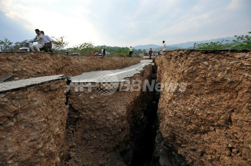 写真は、ミャンマー北東部のターレイ(Tarlay)で、道路に入った大きな亀裂(2011年3月26日撮影)。(c)AFP/Soe Than WIN