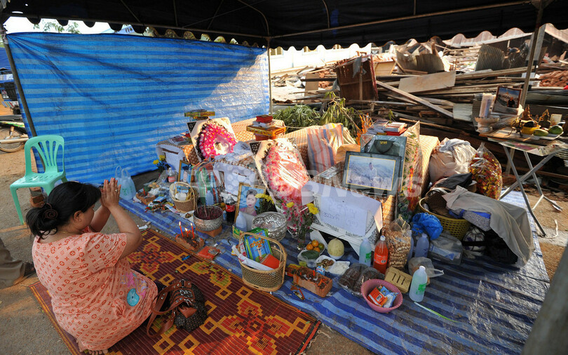 写真は、ミャンマー北東部のターレイ(Tarlay)で、地震で亡くなった人の棺を安置した祭壇の前で祈る女性(2011年3月26日撮影)。(c)AFP/Soe Than WIN