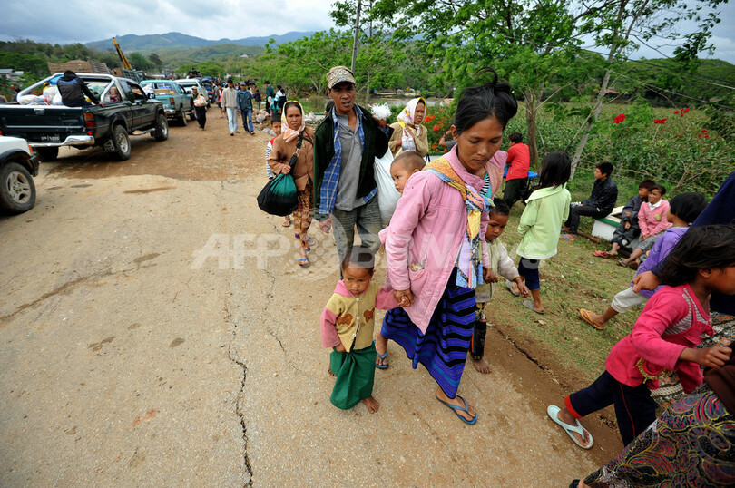 ミャンマー政府は26日、この地震による国内の死者は74人と発表し、タイで死亡した女性1人と合わせてこの地震による公式な死者数は75人のままだが、ミャンマーの亡命メディア大手イラワジ(Irrawaddy)の報道によると、最も被害の大きかったとみられるタイ国境近くの町タチレク(Tachileik)で活動中の赤十字職員は、死者は少なくとも150人に上ると語っている。国際NGOワールド・ビジョン(World Vision)は、被災者は1万5000人との見方を示している。(c)AFP/Soe Than Win