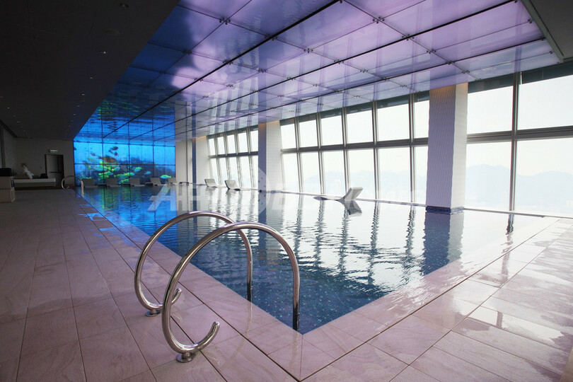 眼下には、活気あふれる市街地のほか、ビクトリア湾や南シナ海の眺望が広がる。デラックスルームは1泊6000香港ドル(約6万3000円)から。最高級のプレジデンシャル・スイートは1泊10万香港ドル(約105万円)だ。写真はリッツカールトンのプール(2011年3月29日撮影)。(c)AFP/ED JONES