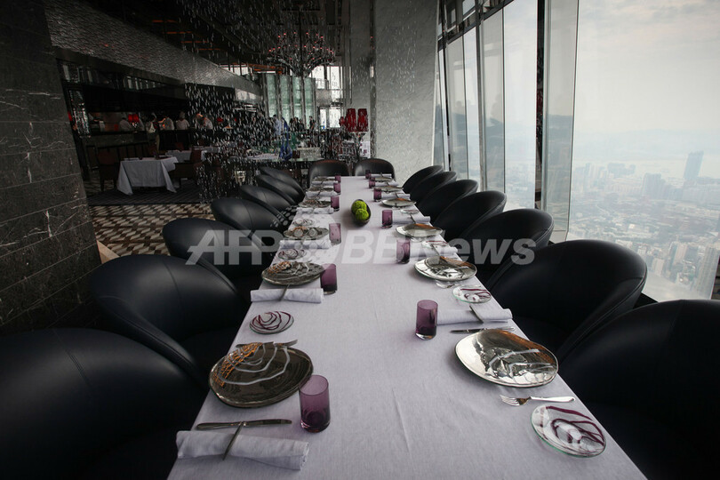 眼下には、活気あふれる市街地のほか、ビクトリア湾や南シナ海の眺望が広がる。デラックスルームは1泊6000香港ドル(約6万3000円)から。最高級のプレジデンシャル・スイートは1泊10万香港ドル(約105万円)だ。写真はリッツカールトンのレストラン(2011年3月29日撮影)。(c)AFP/ED JONES