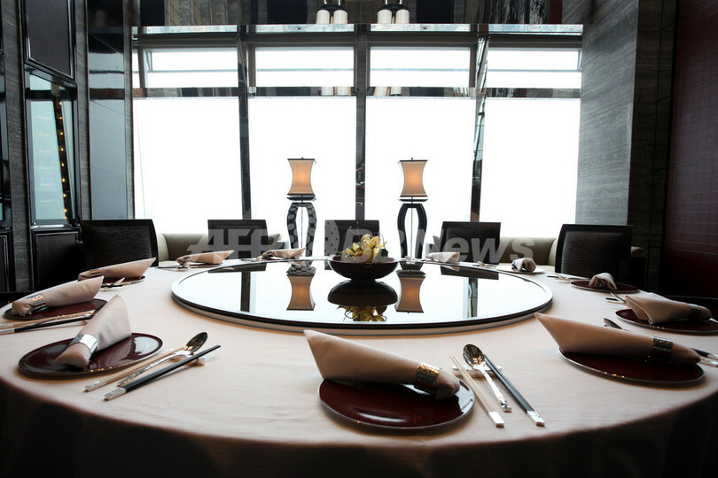 眼下には、活気あふれる市街地のほか、ビクトリア湾や南シナ海の眺望が広がる。デラックスルームは1泊6000香港ドル(約6万3000円)から。最高級のプレジデンシャル・スイートは1泊10万香港ドル(約105万円)だ。写真はリッツカールトンのレストラン(2011年3月29日撮影)。(c)AFP/ED JONES