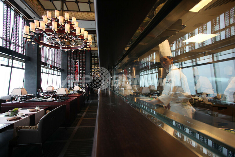 眼下には、活気あふれる市街地のほか、ビクトリア湾や南シナ海の眺望が広がる。デラックスルームは1泊6000香港ドル(約6万3000円)から。最高級のプレジデンシャル・スイートは1泊10万香港ドル(約105万円)だ。写真はリッツカールトンのレストラン(2011年3月29日撮影)。(c)AFP/ED JONES