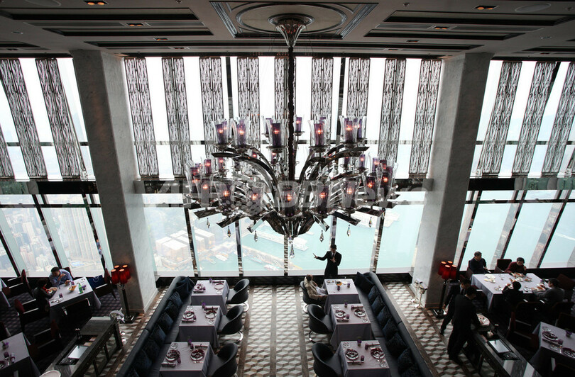 眼下には、活気あふれる市街地のほか、ビクトリア湾や南シナ海の眺望が広がる。デラックスルームは1泊6000香港ドル(約6万3000円)から。最高級のプレジデンシャル・スイートは1泊10万香港ドル(約105万円)だ。写真はリッツカールトンのレストラン(2011年3月29日撮影)。(c)AFP/ED JONES