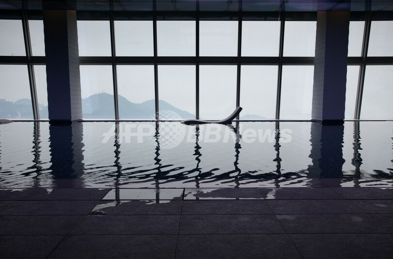 眼下には、活気あふれる市街地のほか、ビクトリア湾や南シナ海の眺望が広がる。デラックスルームは1泊6000香港ドル(約6万3000円)から。最高級のプレジデンシャル・スイートは1泊10万香港ドル(約105万円)だ。写真はリッツカールトンのプール(2011年3月29日撮影)。(c)AFP/ED JONES