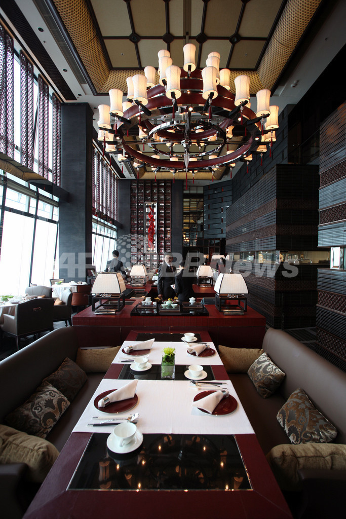 眼下には、活気あふれる市街地のほか、ビクトリア湾や南シナ海の眺望が広がる。デラックスルームは1泊6000香港ドル(約6万3000円)から。最高級のプレジデンシャル・スイートは1泊10万香港ドル(約105万円)だ。写真はリッツカールトンのレストラン(2011年3月29日撮影)。(c)AFP/ED JONES