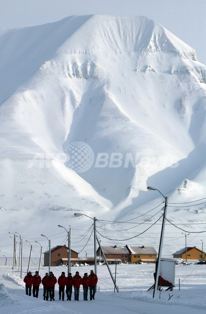 写真は、ノルウェー領スピッツベルゲン(Spitsbergen)島で探検隊に合流したヘンリー王子(左から2人目、2011年3月29日撮影)。(c)AFP/WPA/DAVID CHESKIN
