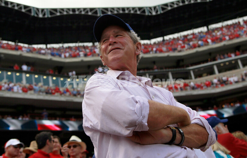 【4月2日 AFP】米国のジョージ・W・ブッシュ(George W. Bush)前大統領が1日、米テキサス(Texas)州アーリントン(Arlington)にある米大リーグ(MLB)のテキサス・レンジャーズ(Texas Rangers)の本拠地、レンジャーズ・ボールパーク・イン・アーリントン(Rangers Ballpark in Arlington)で、レンジャーズの開幕戦を観戦した。(c)AFP/Getty Images