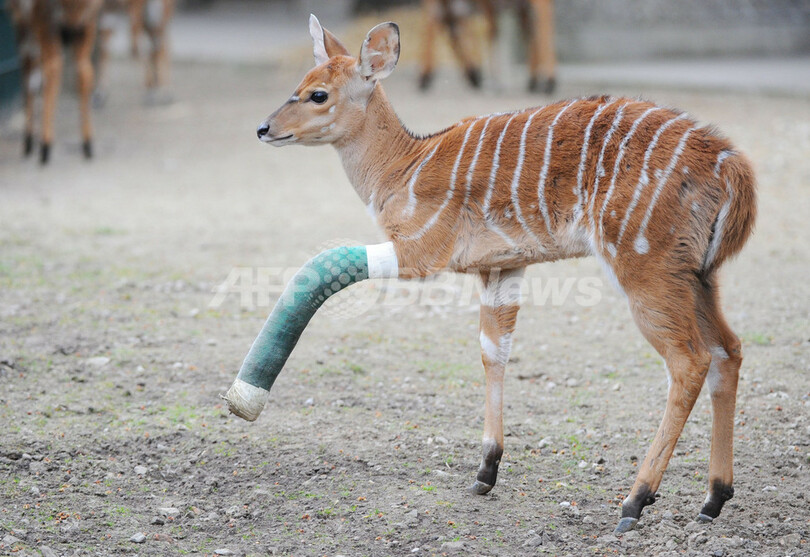 【4月2日 AFP】ドイツ中部ハノーバー(Hanover)の動物園で、けがをしてギプスによる固定治療を受けるニアラの子どもの姿が見られた。