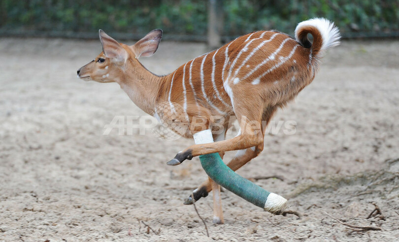 ギプスの脚で走り回るニアラの子ども、独ハノーバー動物園