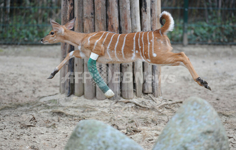 【4月2日 AFP】ドイツ中部ハノーバー(Hanover)の動物園で、けがをしてギプスによる固定治療を受けるニアラの子どもの姿が見られた。