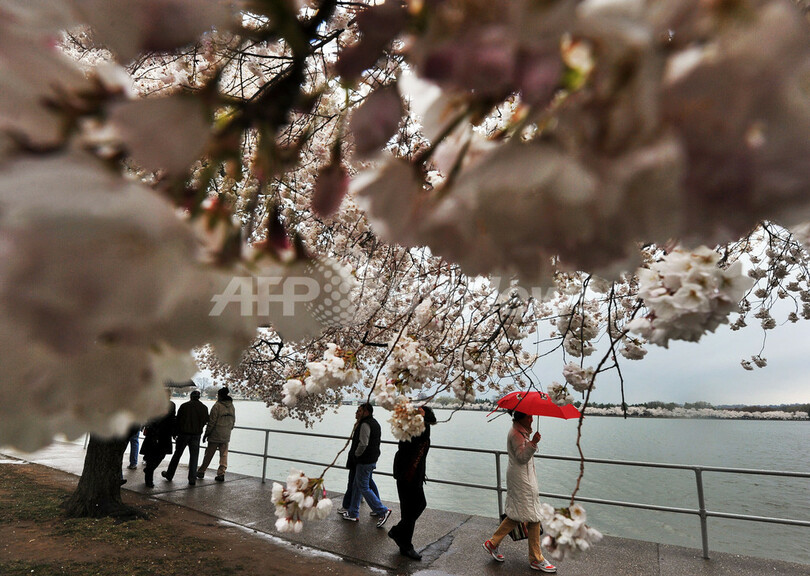 【4月3日 AFP】米ワシントンD.C.(Washington D.C.)・ポトマック川(Potomac River)沿いの桜の名所、タイダル・ベイスン(Tidal Basin)では2日、あいにくの雨と肌寒い気温にもかかわらず、大勢の人が桜の花を見に訪れた。