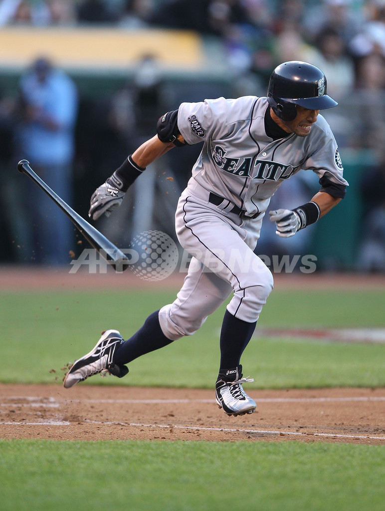 マリナーズのイチロー(Ichiro Suzuki)は5打数2安打1打点を記録、一方アスレチックスの松井秀喜(Hideki Matsui)は4打数無安打に終わった。(c)AFP