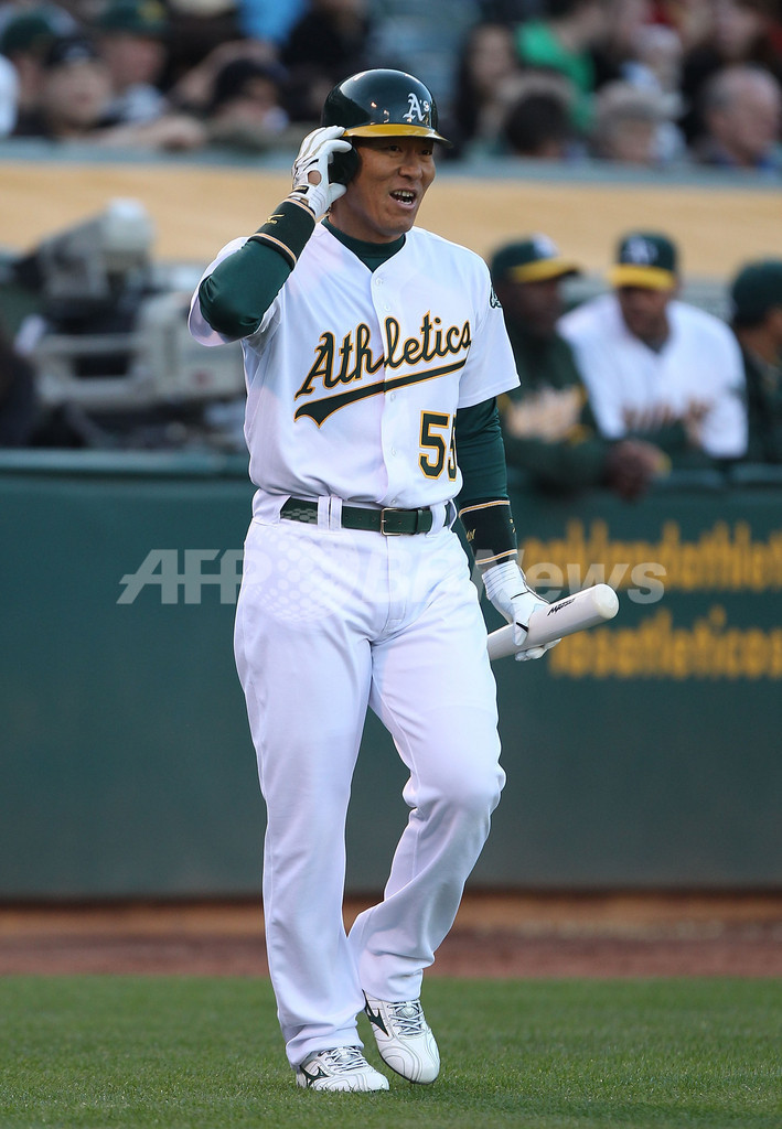 マリナーズのイチロー(Ichiro Suzuki)は5打数2安打1打点を記録、一方アスレチックスの松井秀喜(Hideki Matsui)は4打数無安打に終わった。(c)AFP