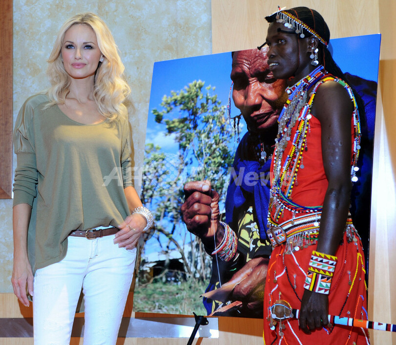 イベントには、マサイ族チーフのWilliam Kikanaeや、同コレクションのキャンペーンモデルを務めるスロバキア出身モデルのエイドリアナ・カランブー(Adriana Karembeu)が出席した。(c)AFP